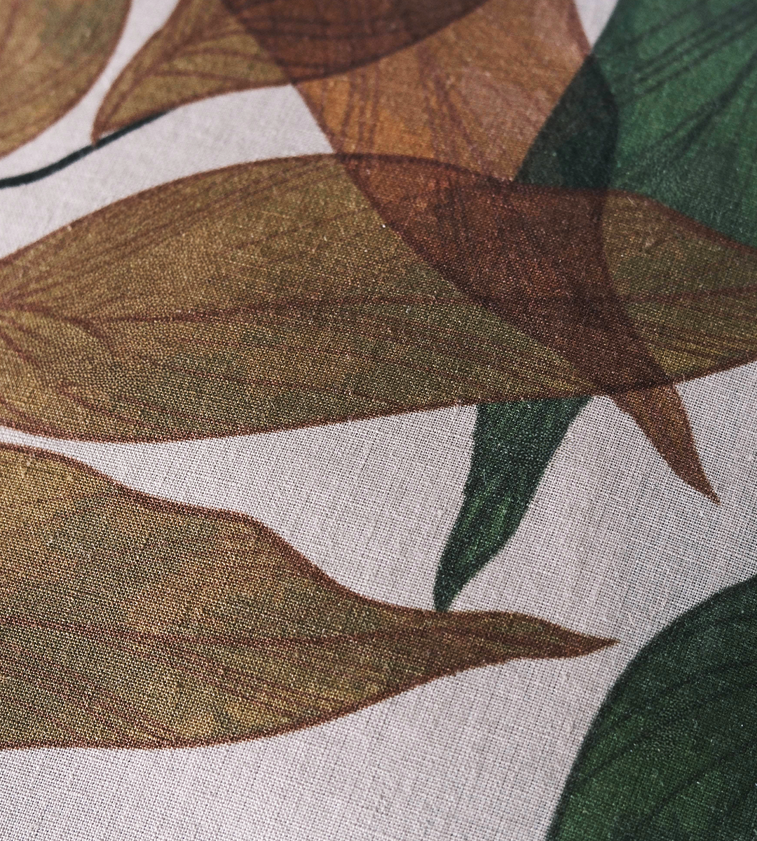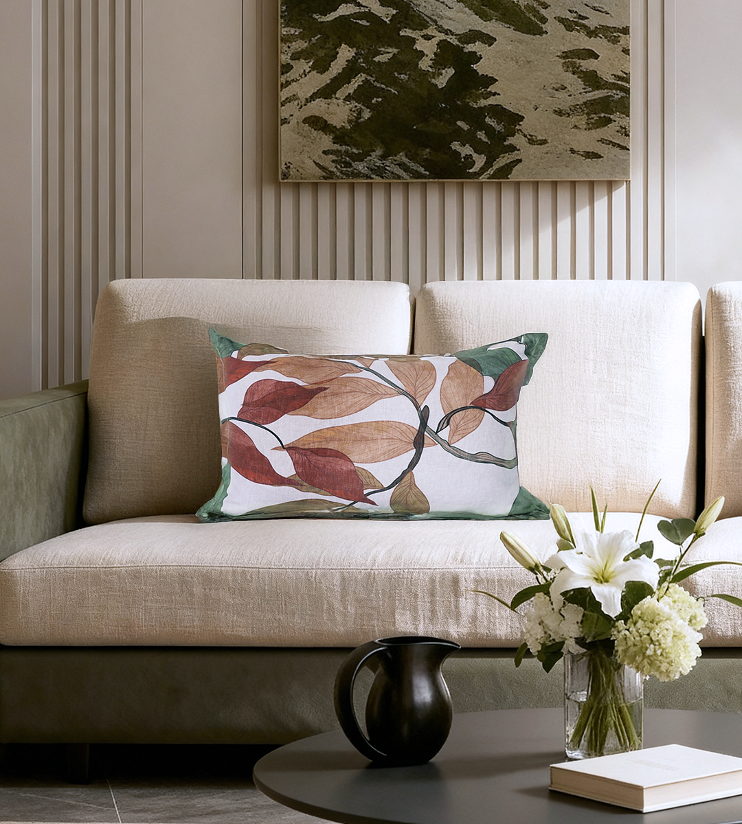 Its flowing leaf motif captures the warmth of autumn tones and the calm of earthy greens, creating a soft, organic statement that feels both expressive and timeless.